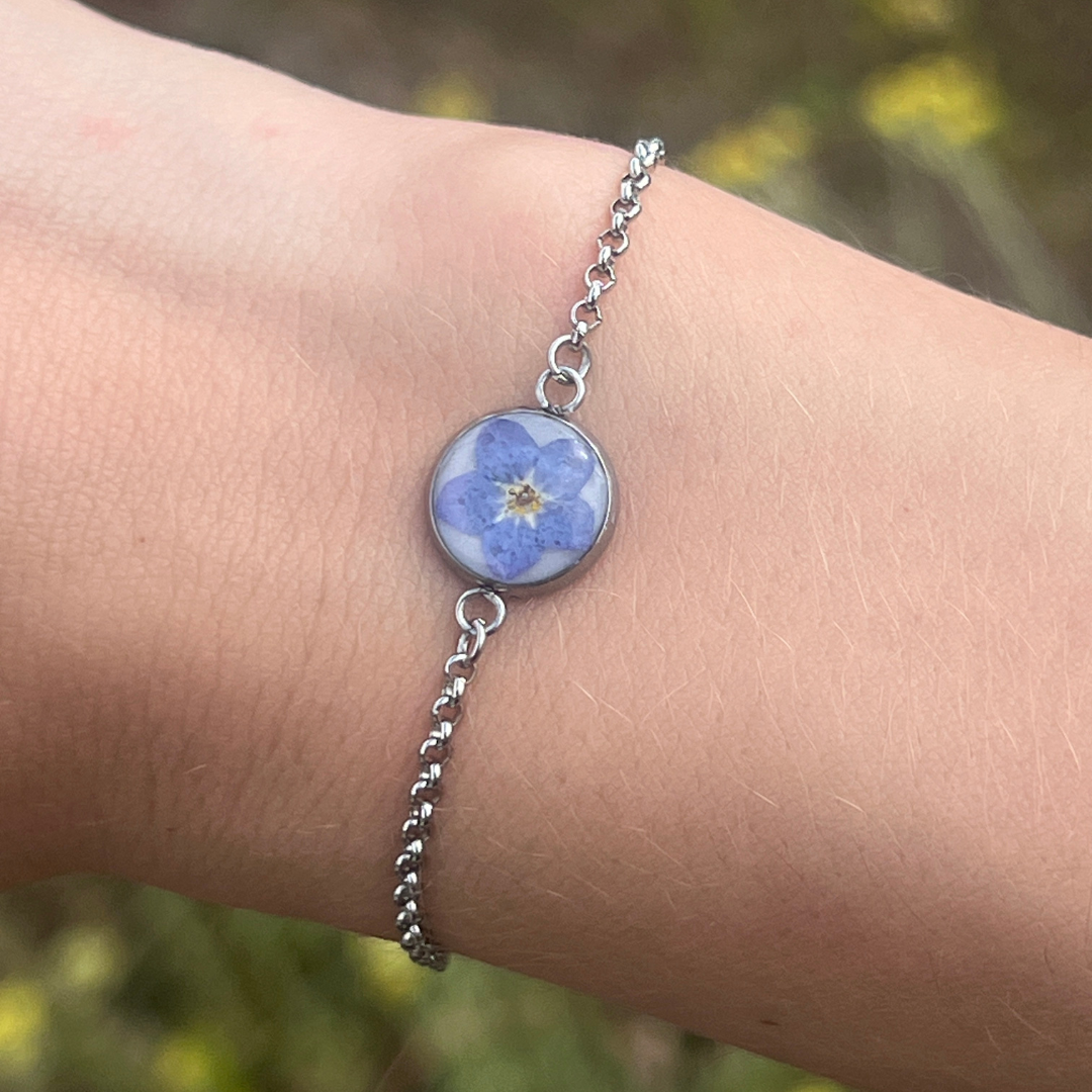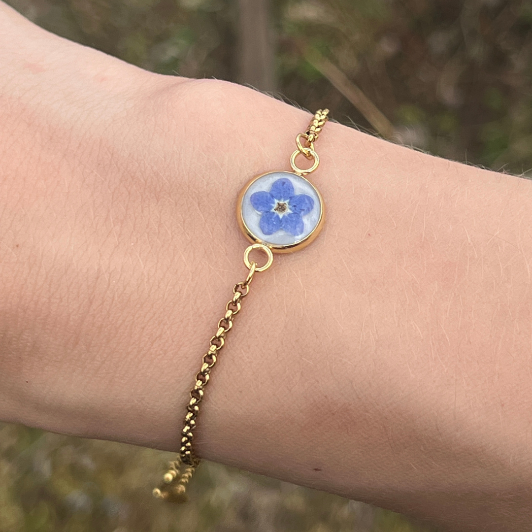 - Wypełnione transparentną żywicą UV z zatopioną suszoną niezapominajką