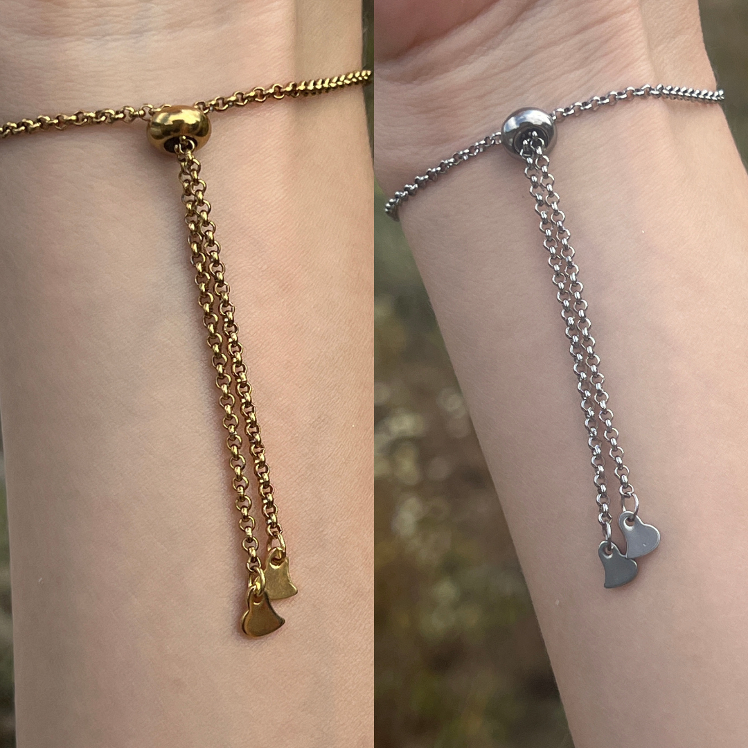 Elementy metalowe to stal chirurgiczna/pozłacana stal chirurgiczna – trwała, hipoalergiczna i odporna na korozję.